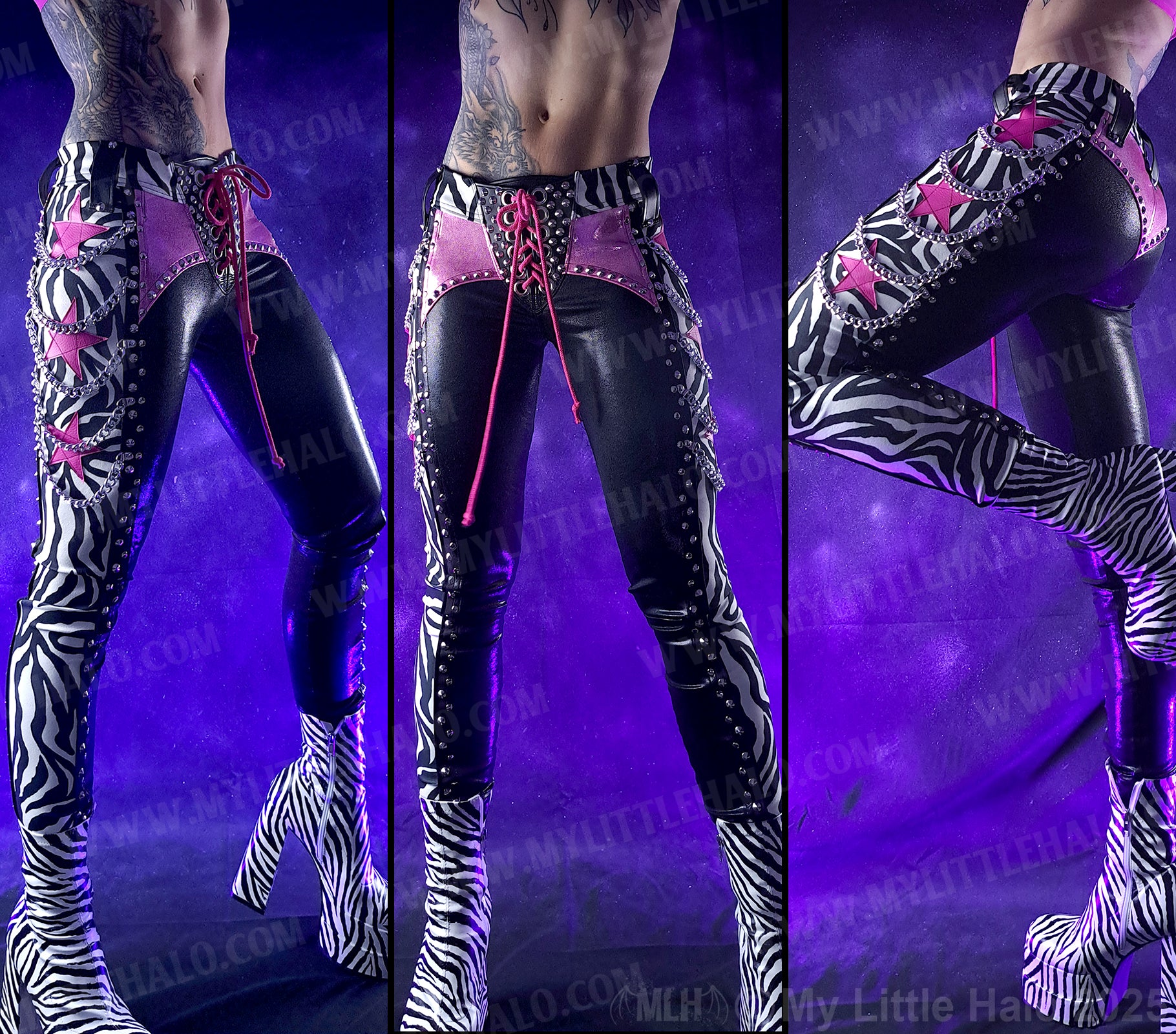 Glam rock pants with zebra print side panels, pink leather stars, pink overlays, silver chains and lace up fly