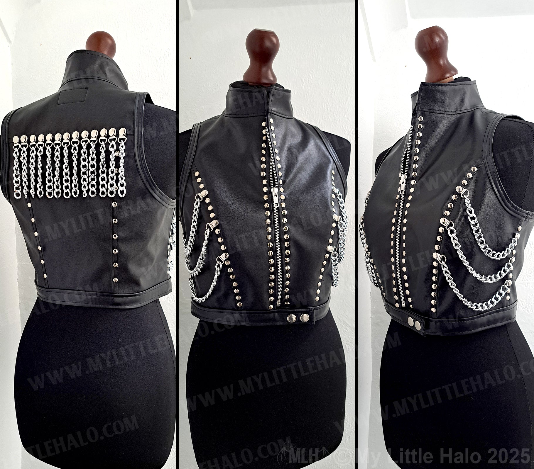Cropped, mini sleeveless jacket made with black faux leather and a soft, spandex inner lining. Silver rivets and chains on the front sides and silver chain fringe at the back. Silver zip front with popper fastening