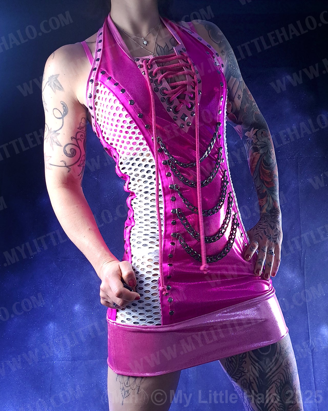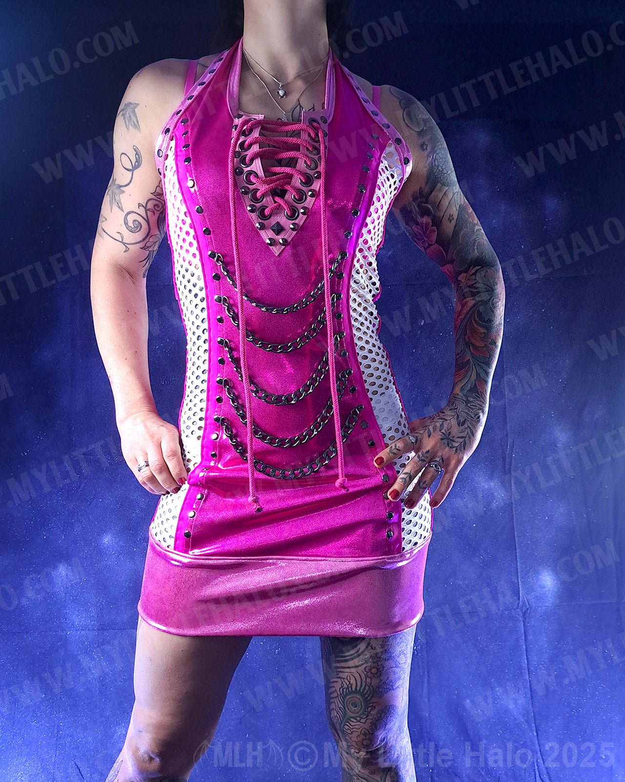 Halter-neck mini dress in dark and light pink with white pothole fishnet side panels, gunmetal rivets and gunmetal chains across the front. Mini lace up on the bust, gunmetal rivets down the back and side seams and light pink finishing on the hems. One of a kind.