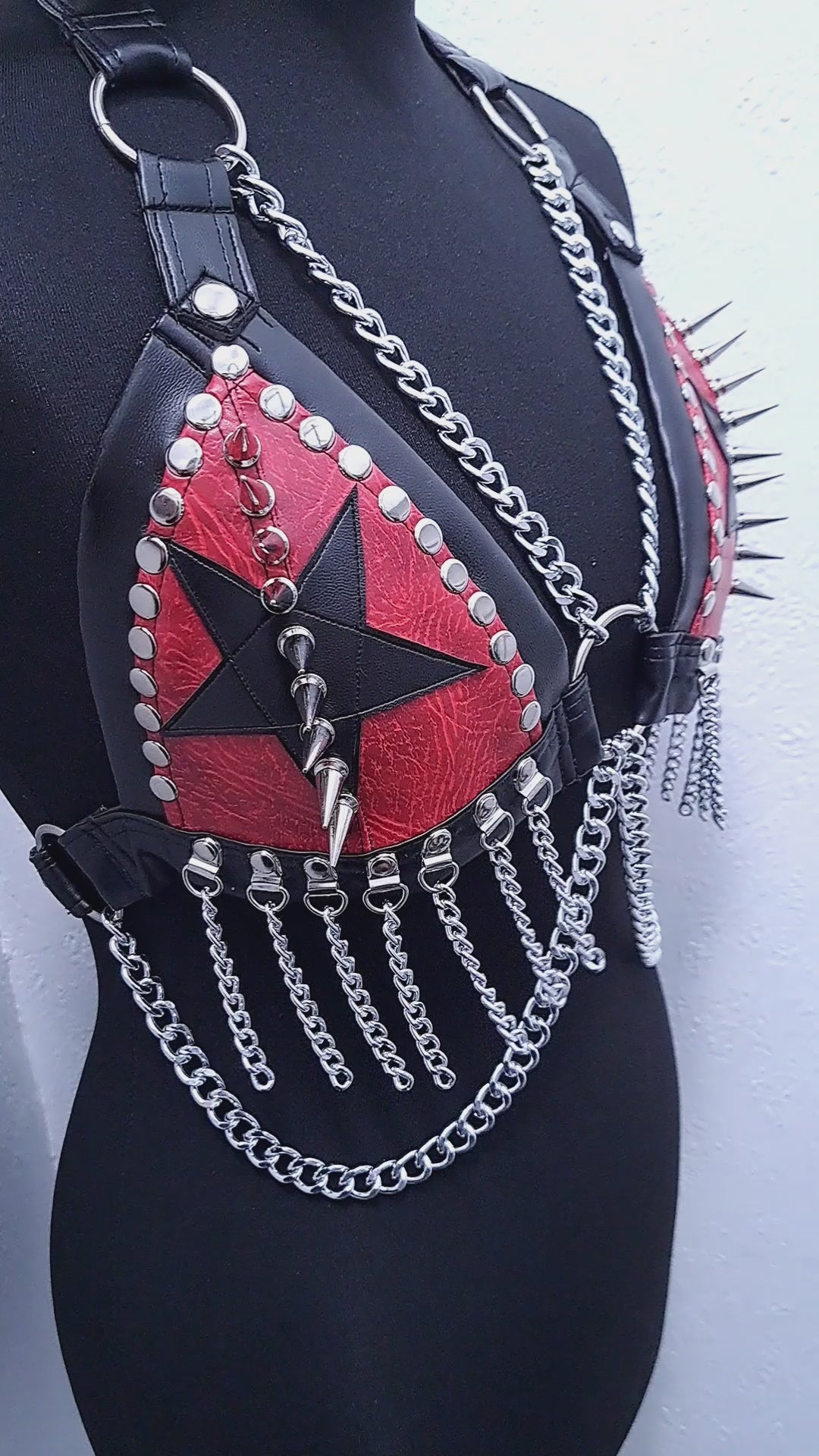 Spiked bikini top in red and black with stars and spikes on the bust, O-rings, chains and highly adjustable halter strap and back strap