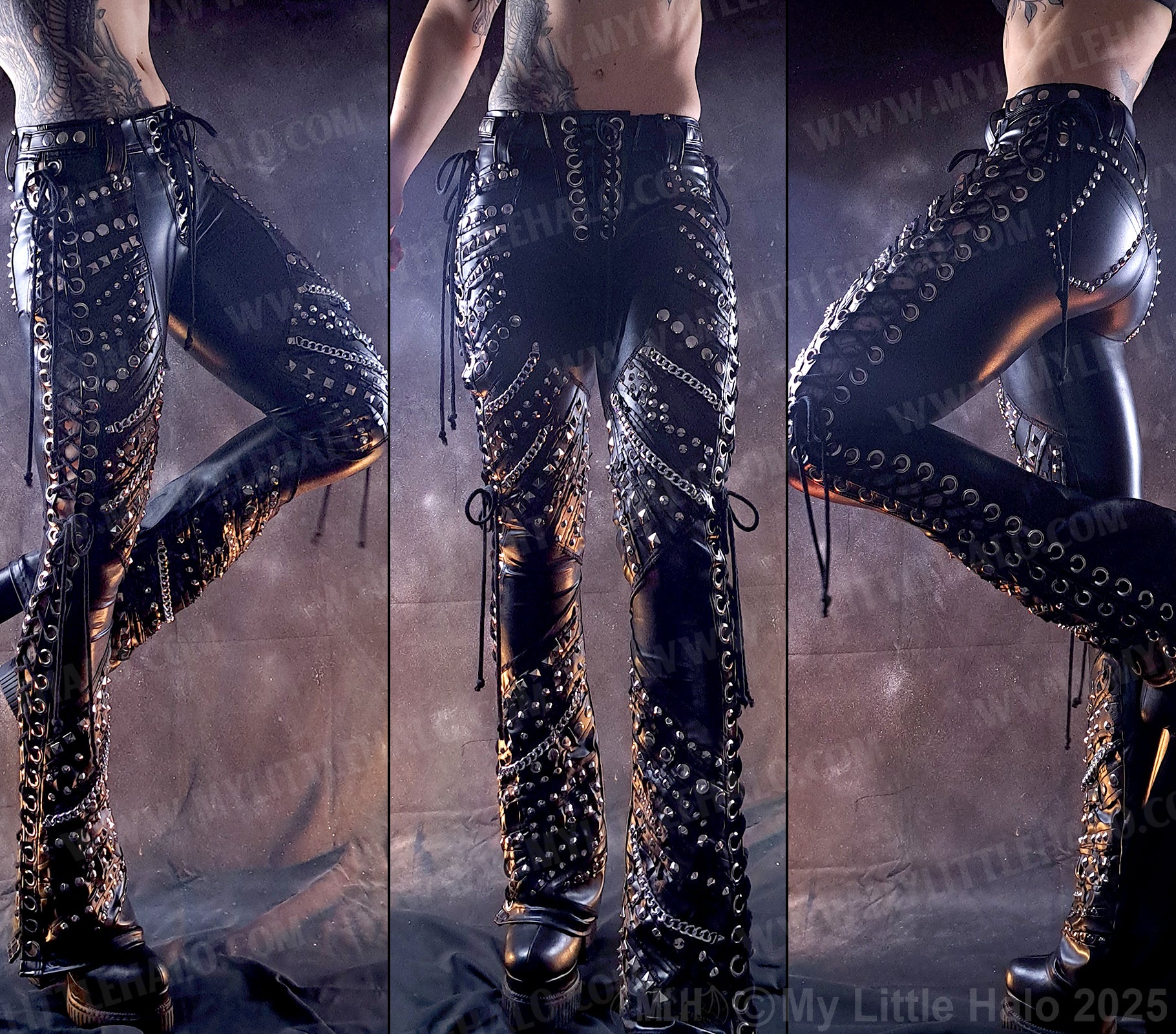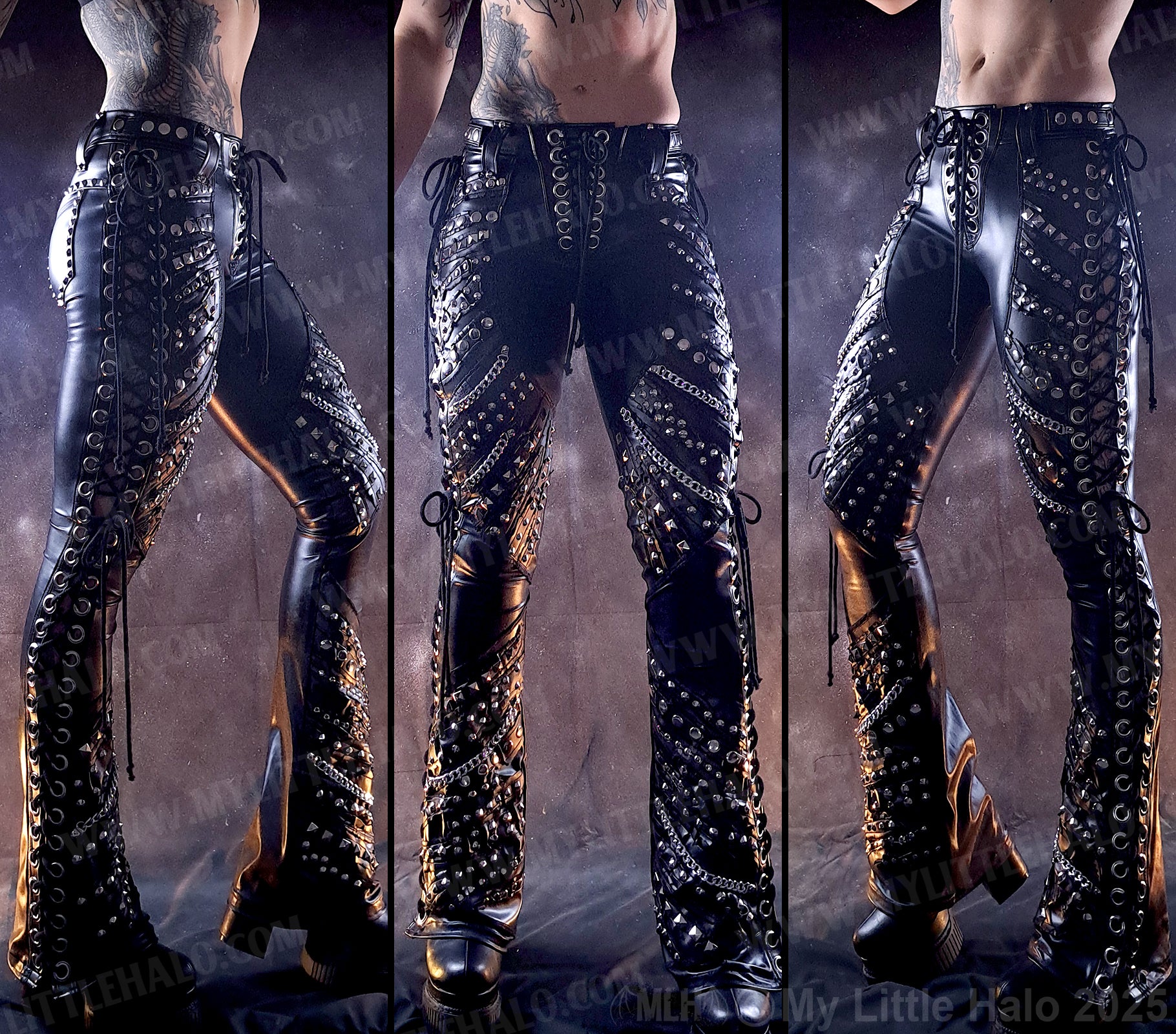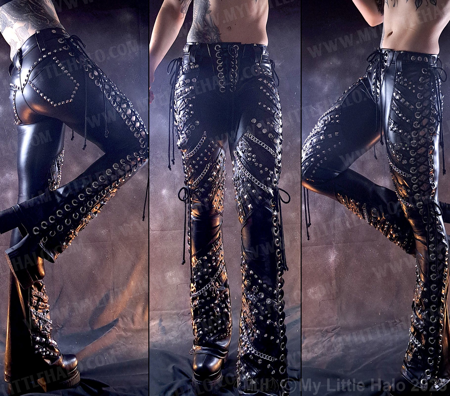 Unique Heavy Metal Lace up Studded Pants – Wet Look, Leather & Silver Hardware