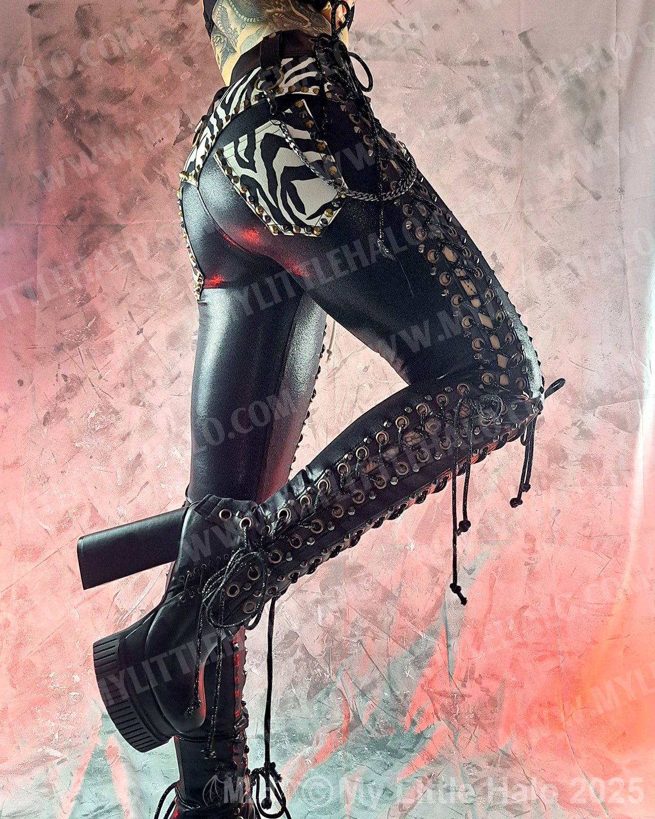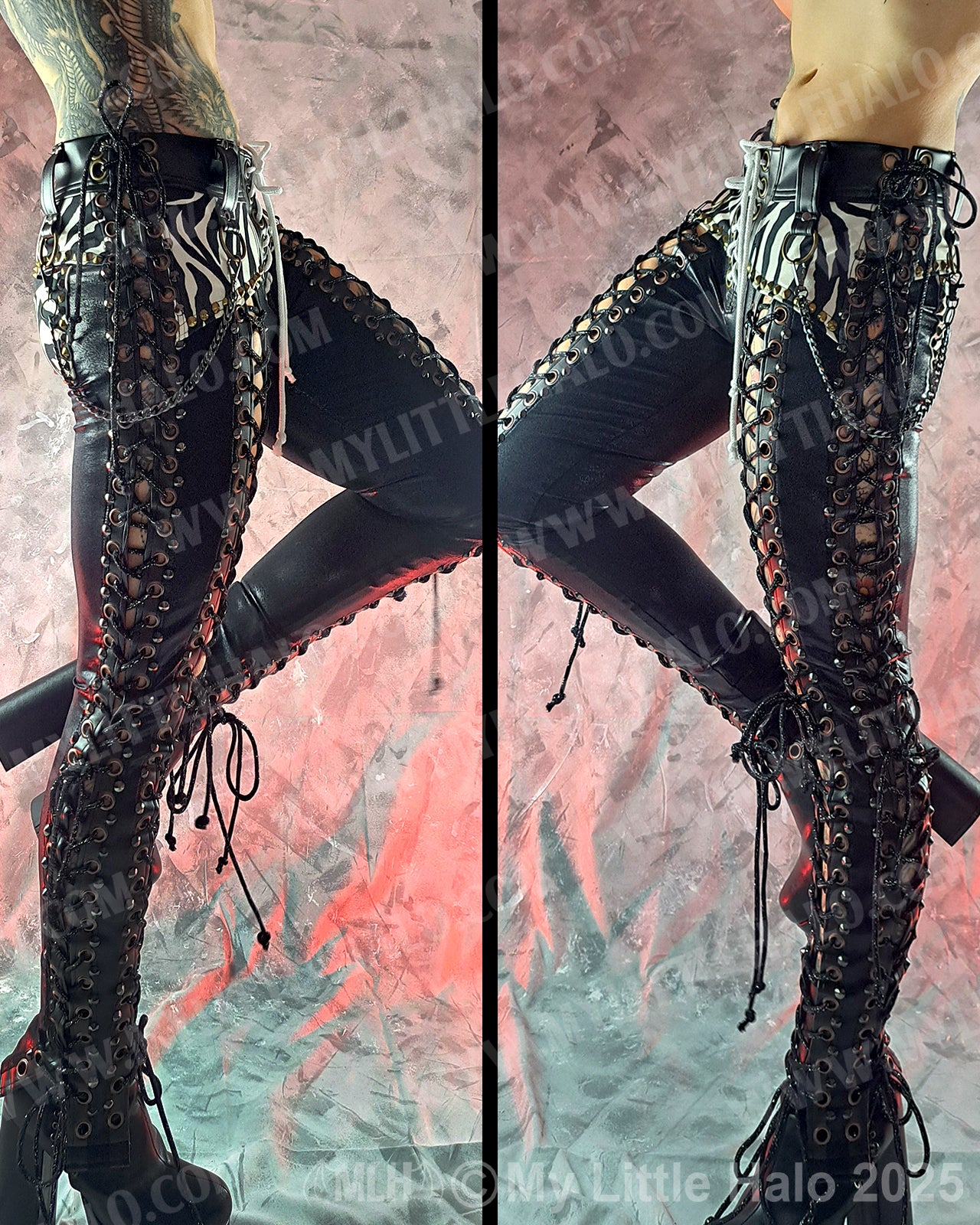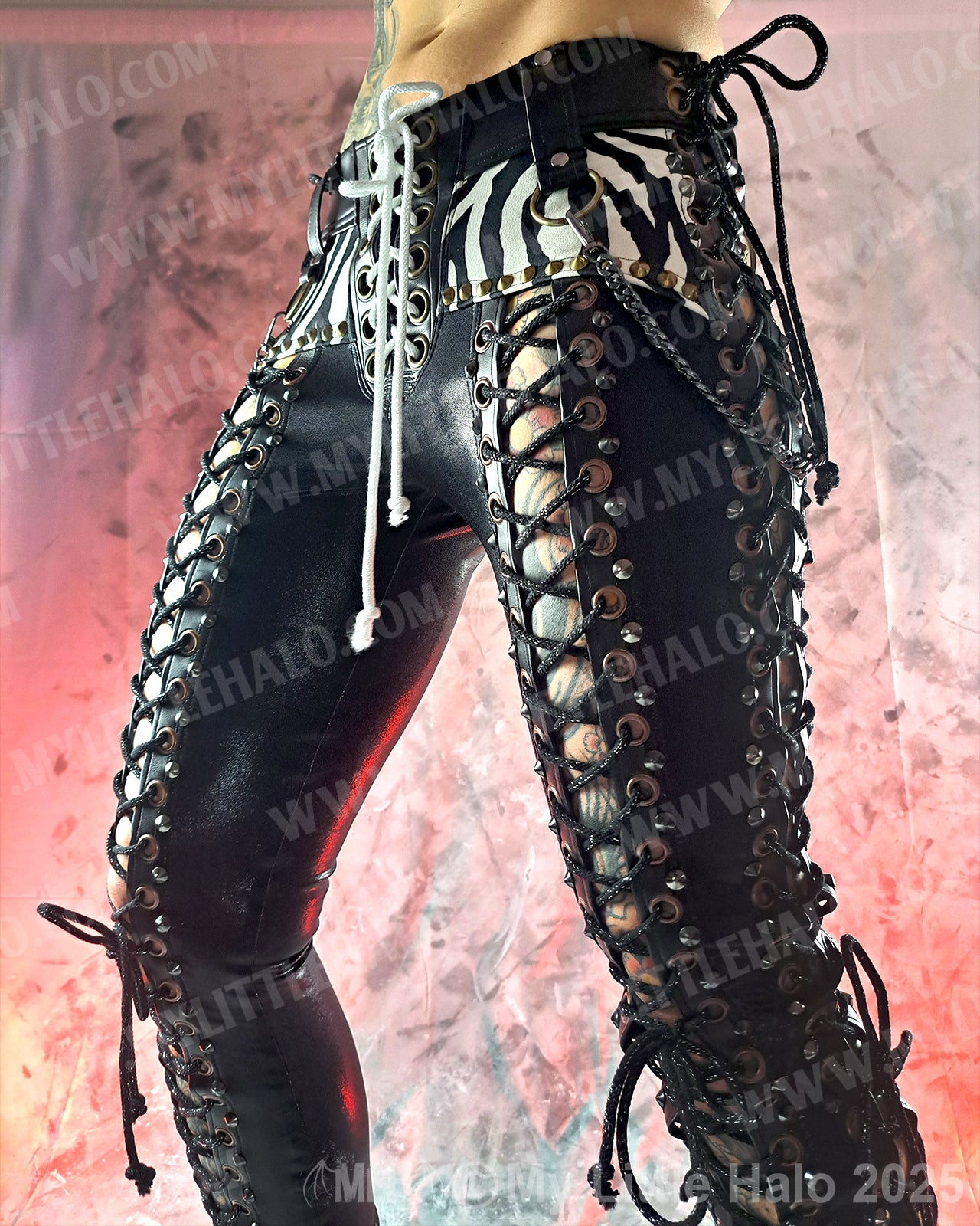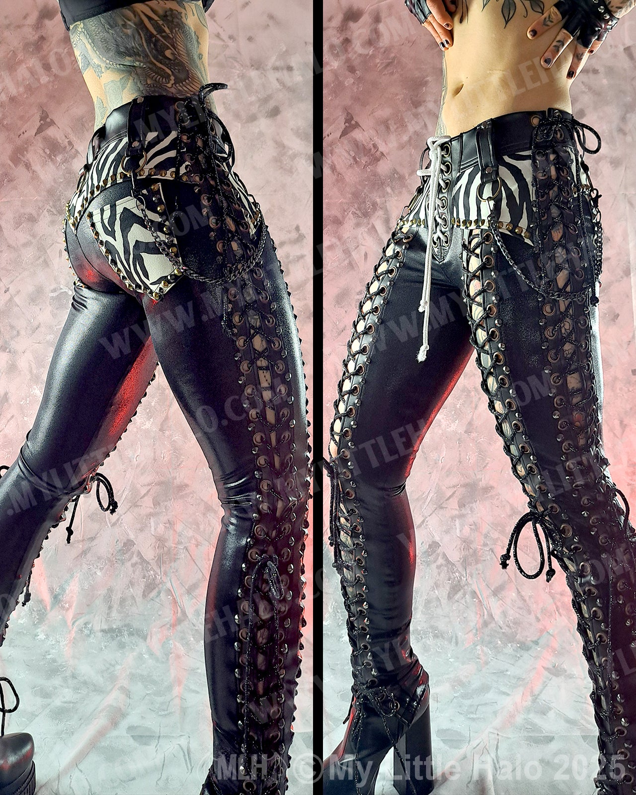 Zebra print, lace up heavy metal pants, in black spandex & leather with zebra print overlays, lace up sides, lace up front with copper eyelets and gunmetal rivets