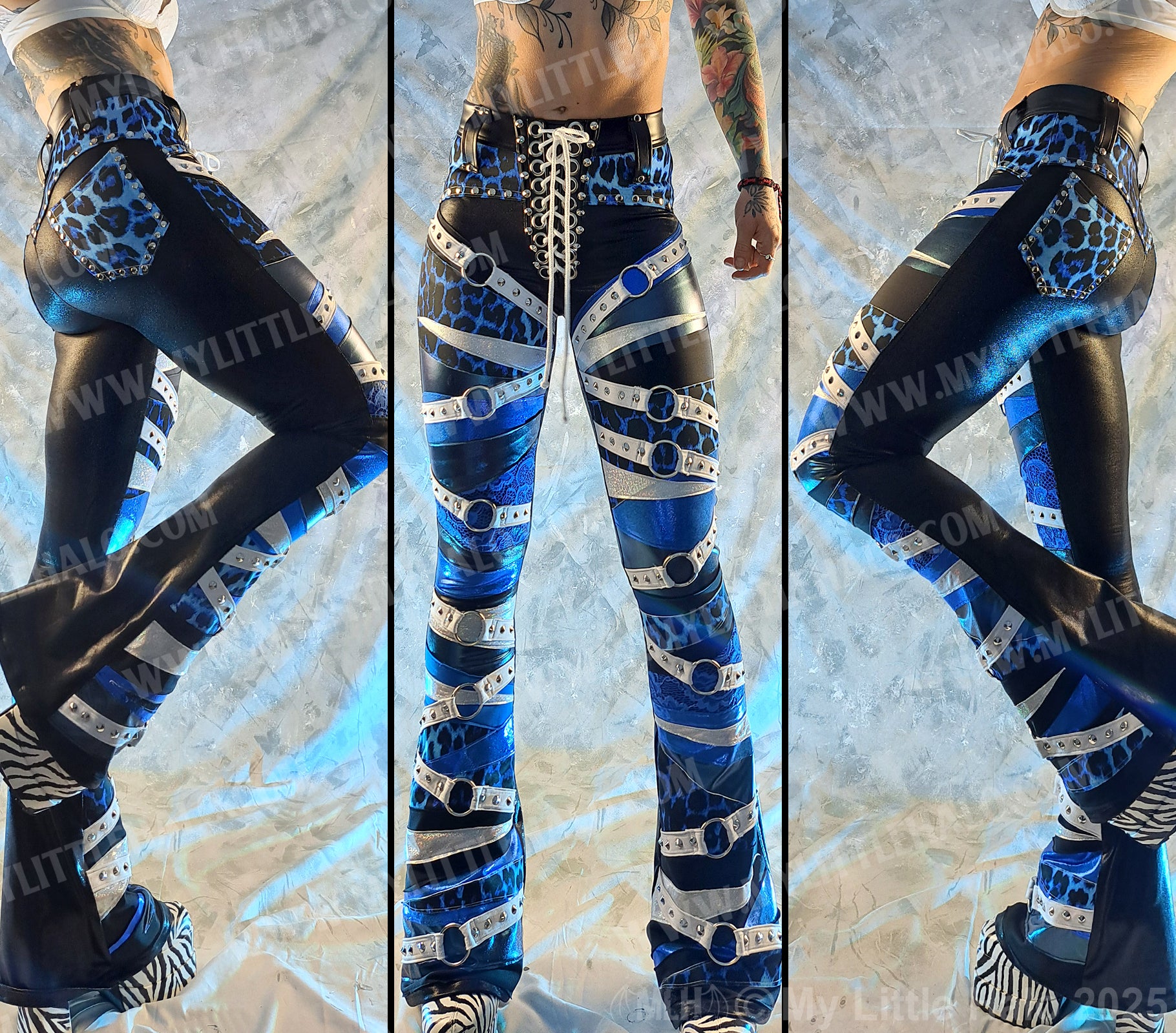 These black, white and blue themed flares are super unique with a patchwork style front design of blue lace, blue metallic and blue leopard print fabrics, then overlaid with white holographic shapes and white O-ring straps and rivets. The front hip and lower back feature the classic My Little Halo curved overlays with rivets and matching back pockets. The pants feature a high waist with stretch leather waistband, studded, lace up fly and belt loops.