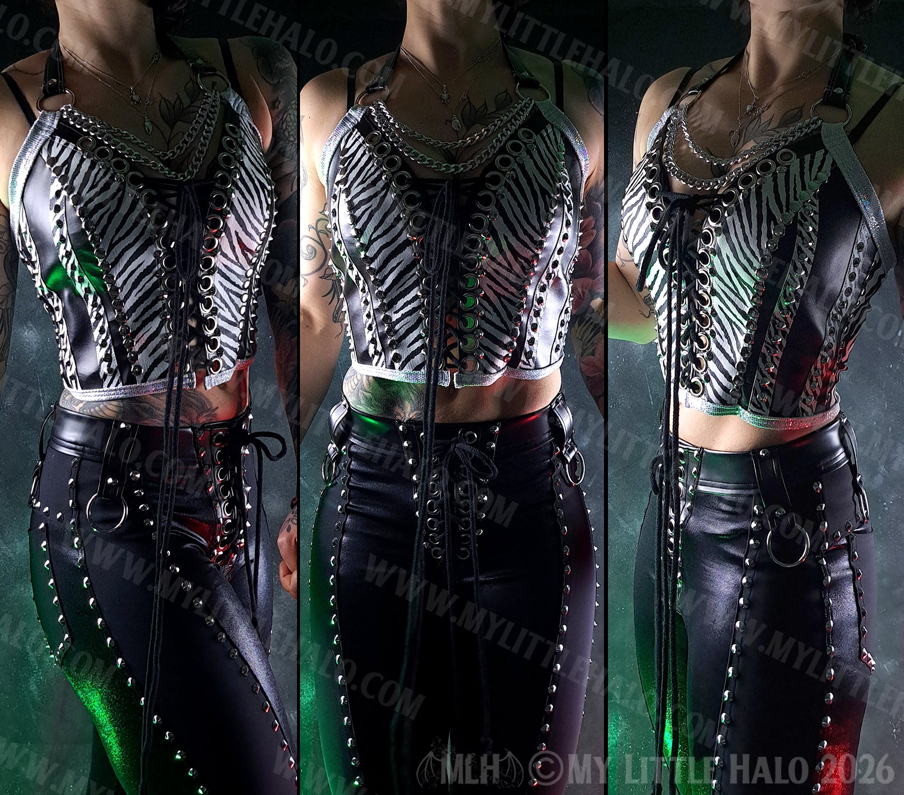 The classic My Little Halo bustier style, made with hand painted zebra print leatherette, black leatherette and silver holographic trimming. The bustier has a fitted front of hand painted black and white zebra print and plain black leatherette with zebra print embellishments and a comfortable stretchy back in black wet look lycra. The stretch back allows for an easier fit and a wider range of size. The soft, spandex internal lining makes this bustier comfortable as well as stylish. With loads of rivets decorating the front, adjustable lace up front and adjustable halter strap with chain decor.