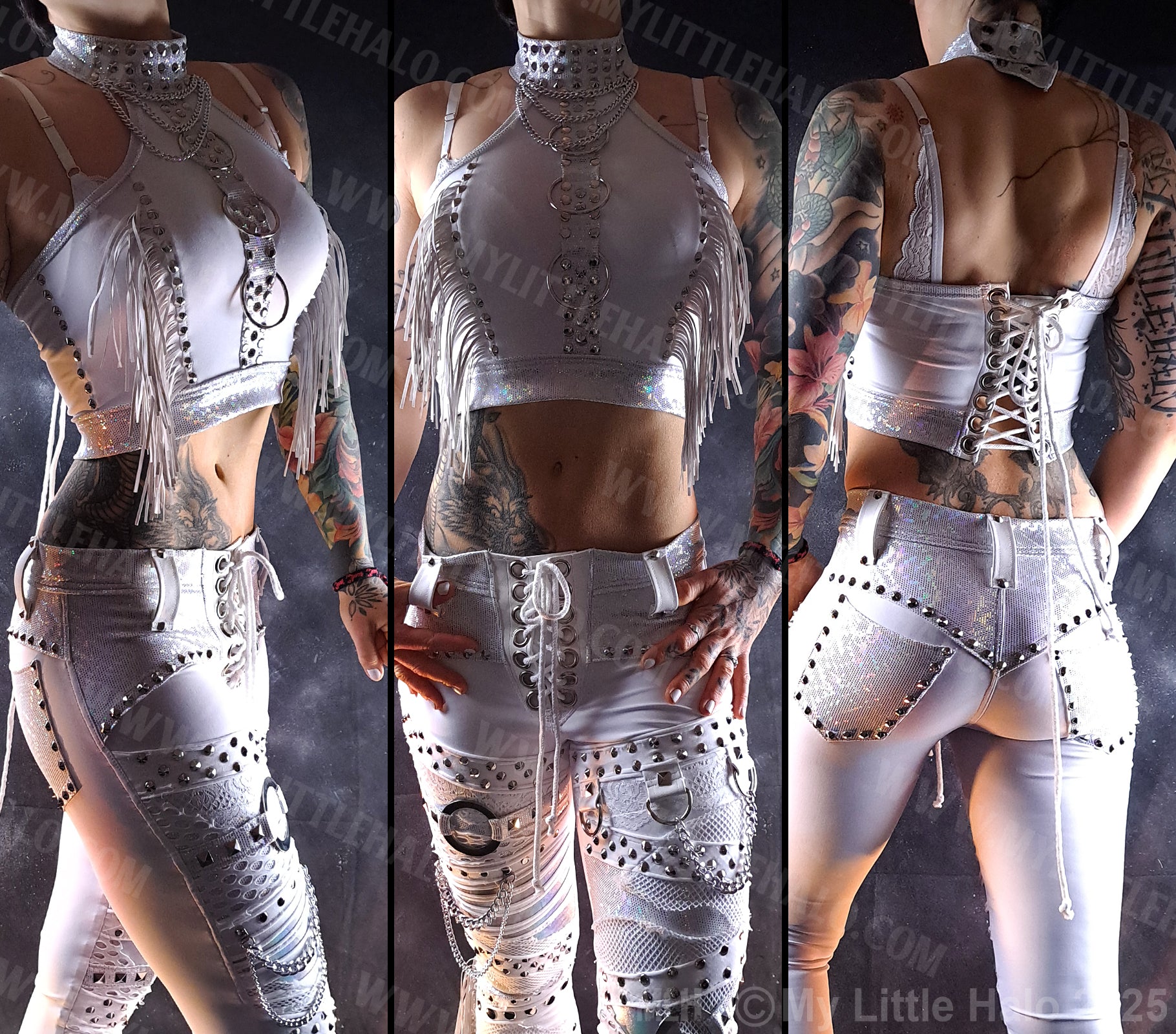 Ultra glam crop top in white spandex and holographic spandex that loves to catch the light and shimmer while the faux leather fringe moves as you do. The combination of glam fabrics, fringe and metal hardware make this another eye-catching piece with loads of silver rivets and giant rings across the front. Pair this top with some simple black or blue skinny jeans to complete any glam metal look. This crop top is made with a base of matte white spandex and is stretchy throughout, this and the adjustable lace up back make is highly versatile in terms of fit, as well as comfort.