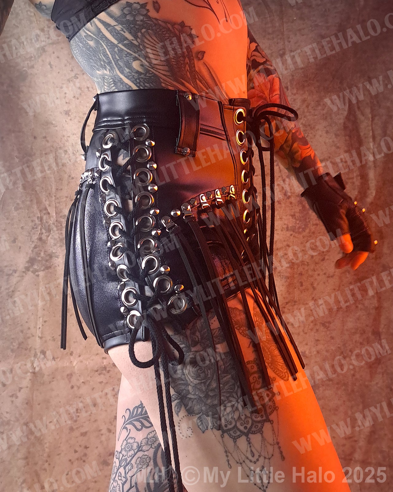 *High waisted shorts with lace up sides, black suede fringe and lace up fly