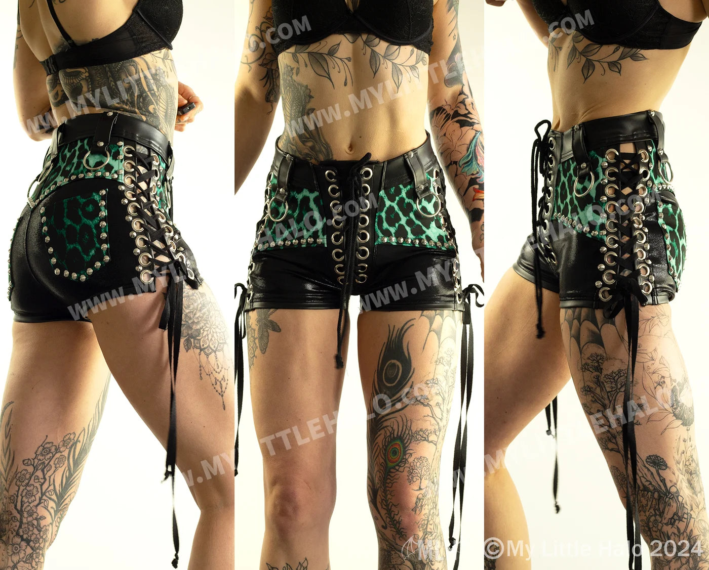*High waisted, green leopard print, rock chick shorts with lace up sides & lace up fly
