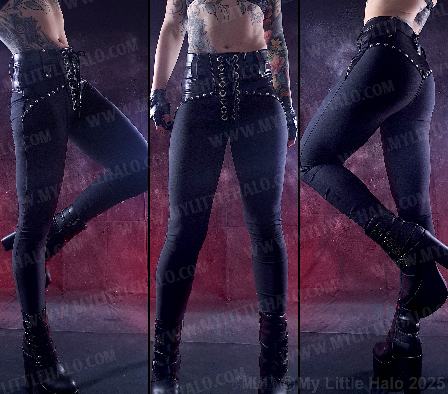 High waisted, matte black skinny leg rock pants in black sports lycra with riveted overlays, leather high waist, lace up fly and belt loops