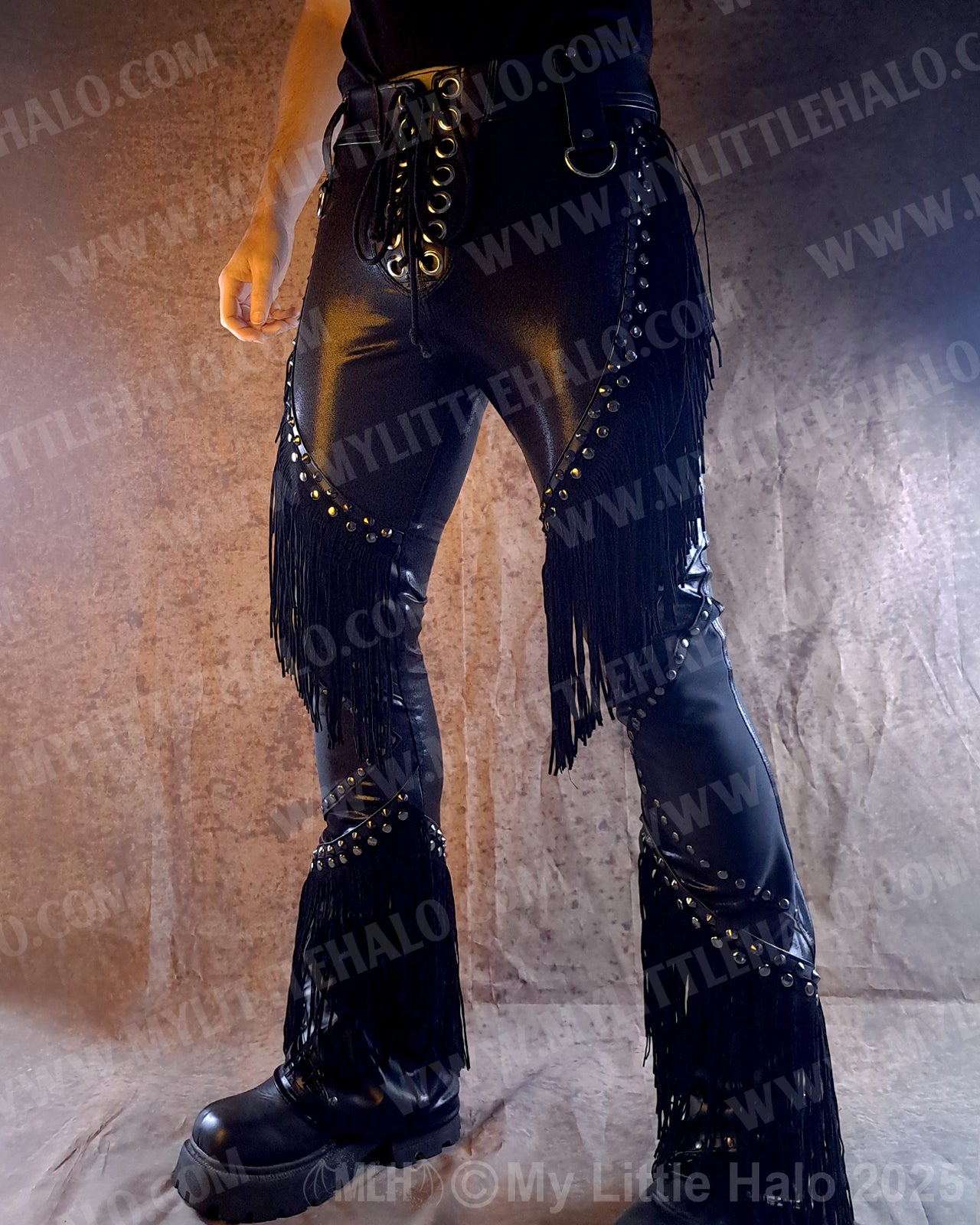 *Leather overlays on thigh & shin with faux suede fringe & gunmetal rivets