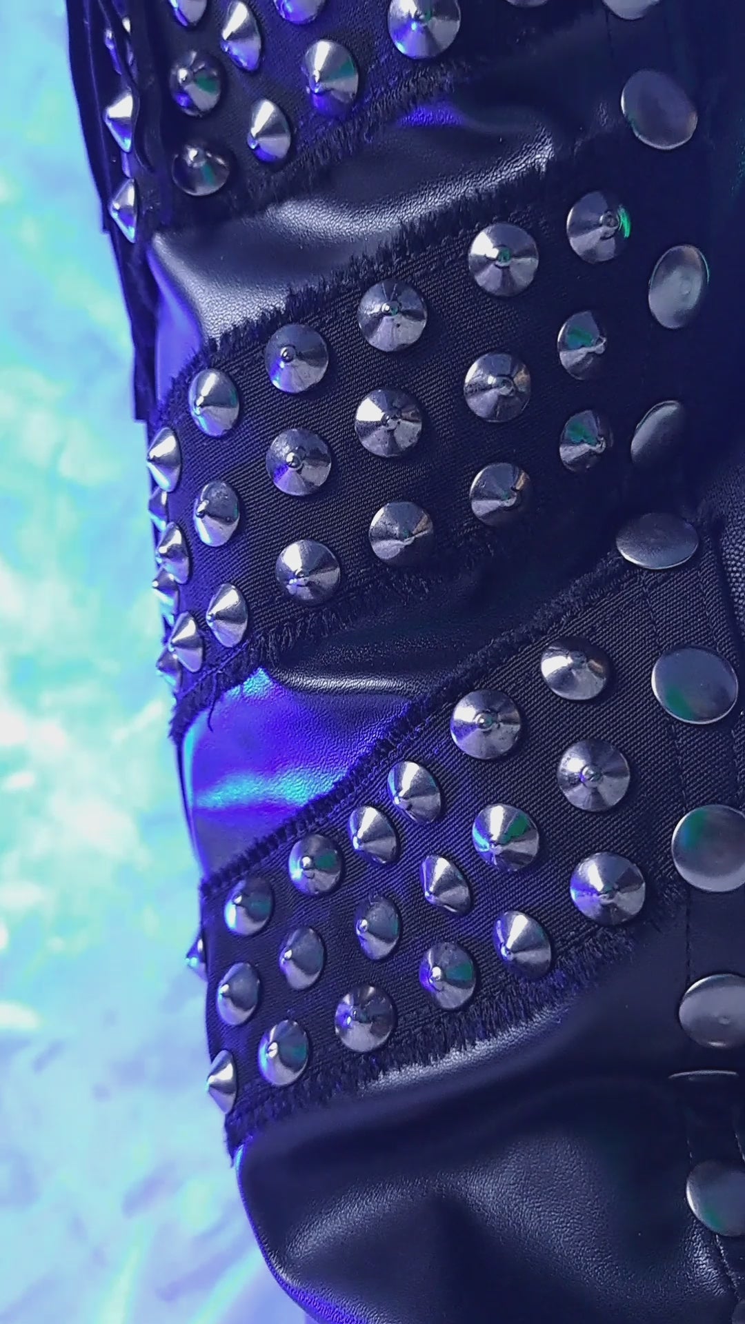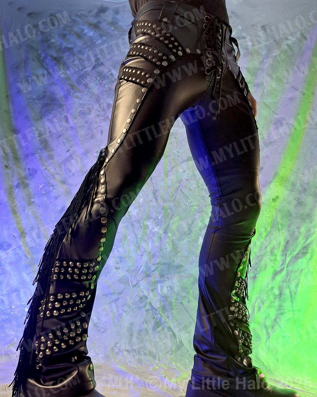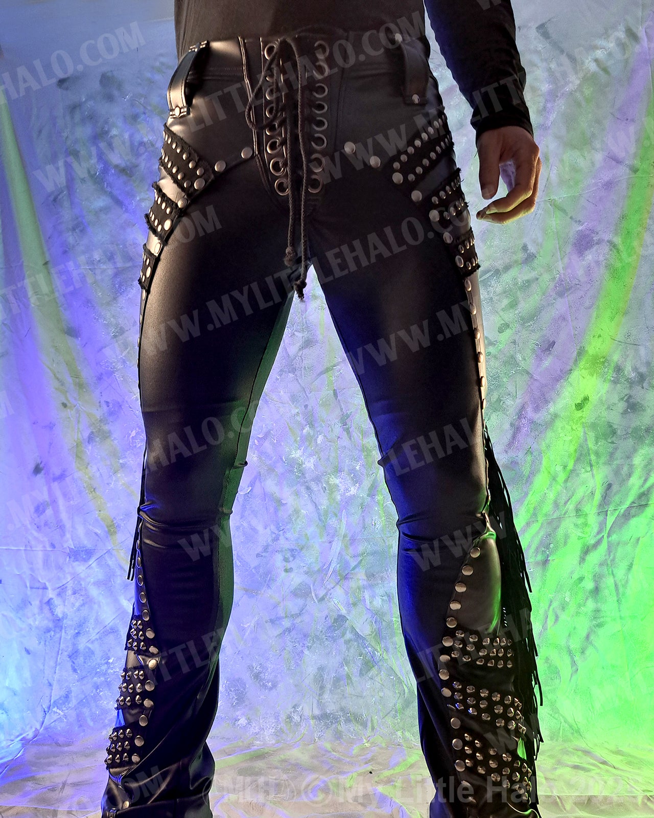 Men’s boot cut pants in matte black shine spandex with faux leather overlays on the front, featuring distressed black denim, covered in gunmetal rivets, with black faux suede fringed sides, riveted overlays and pockets at the back, stretch faux leather waist, lace up fly and belt loops. One of a kind.