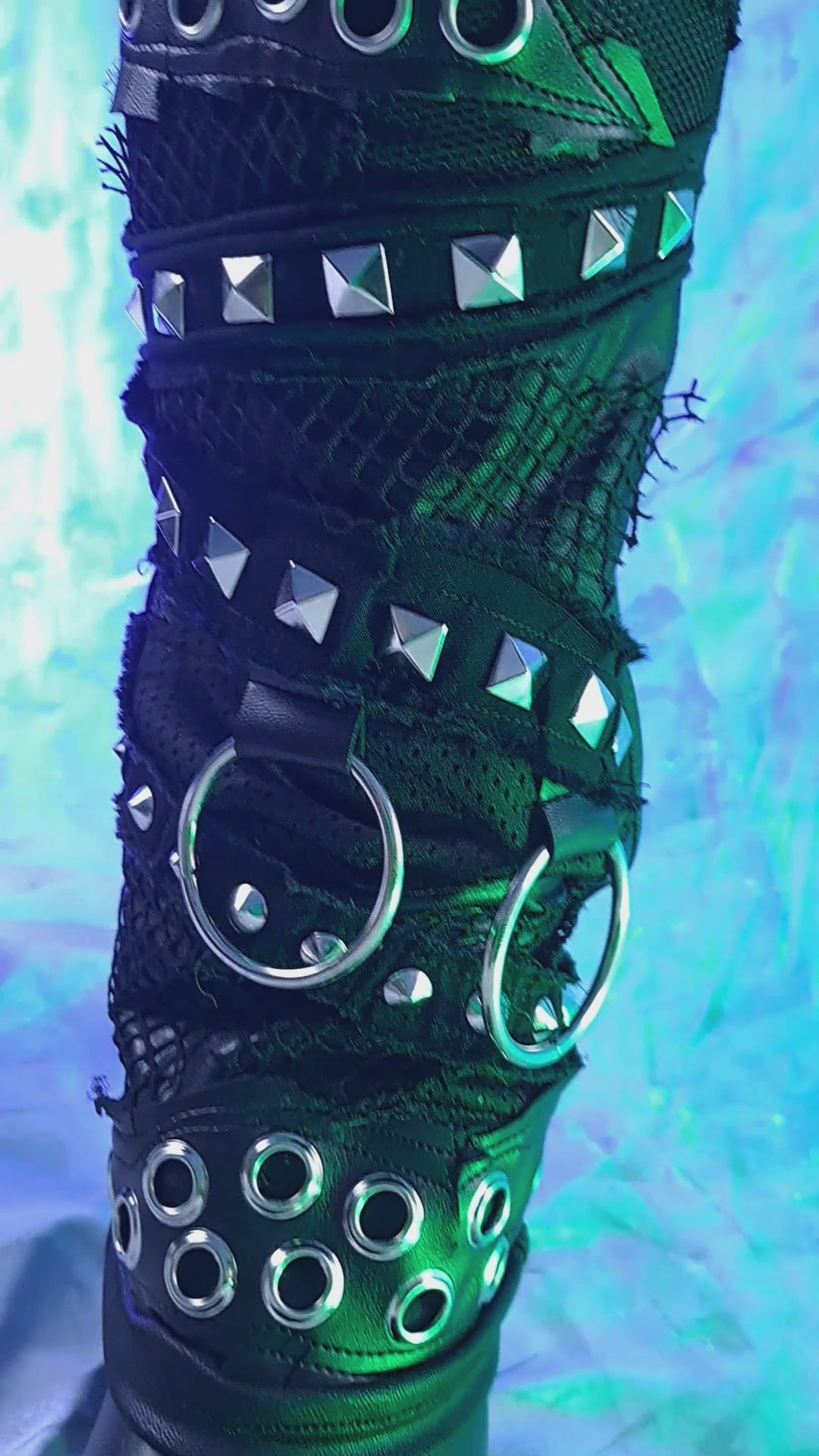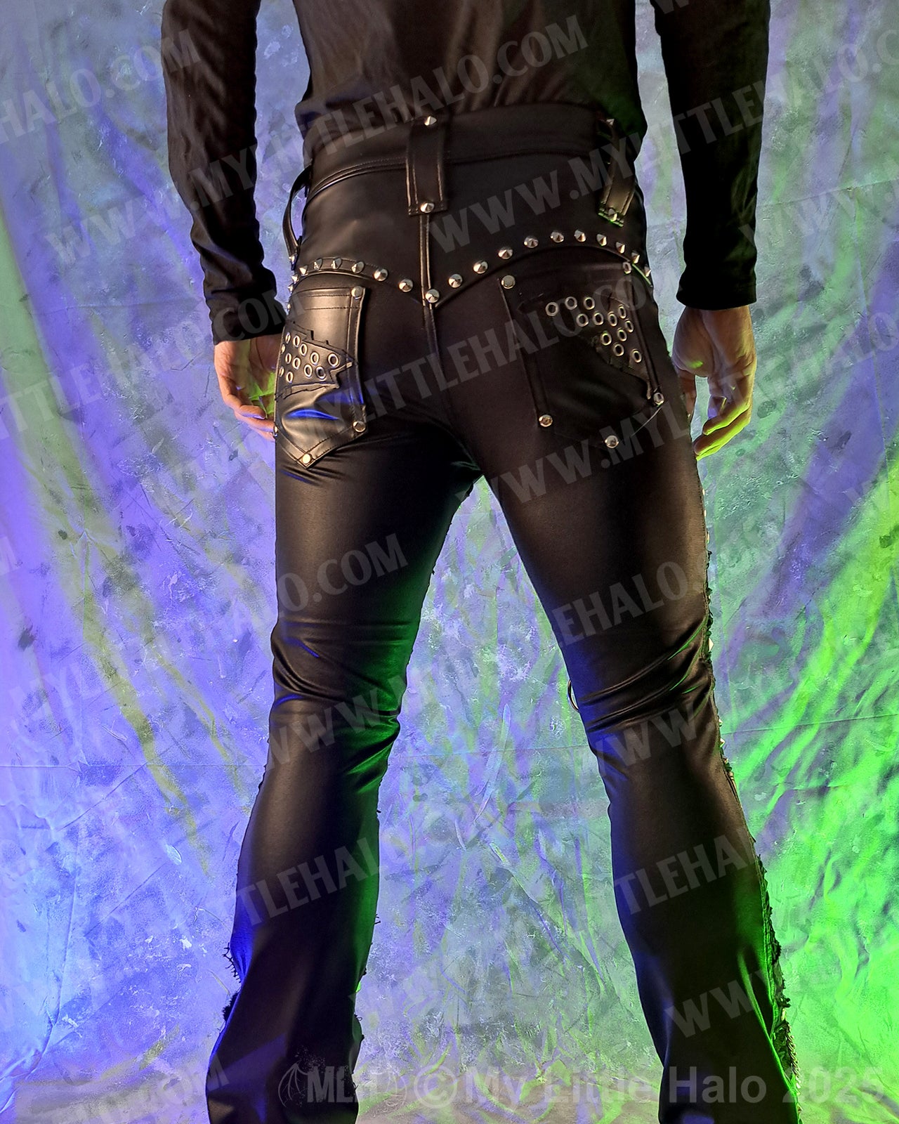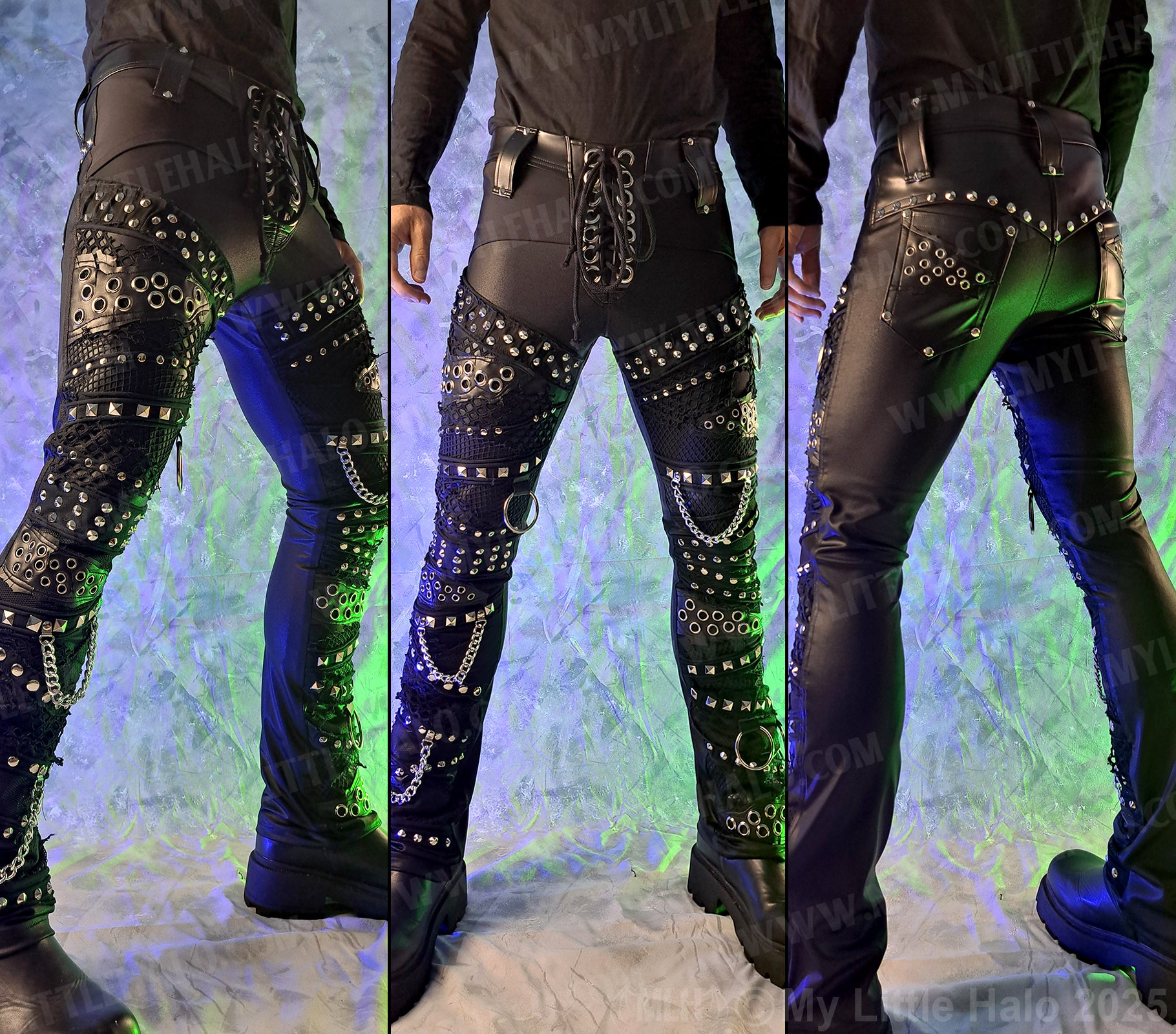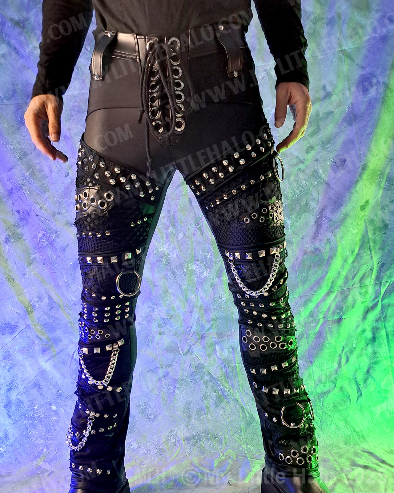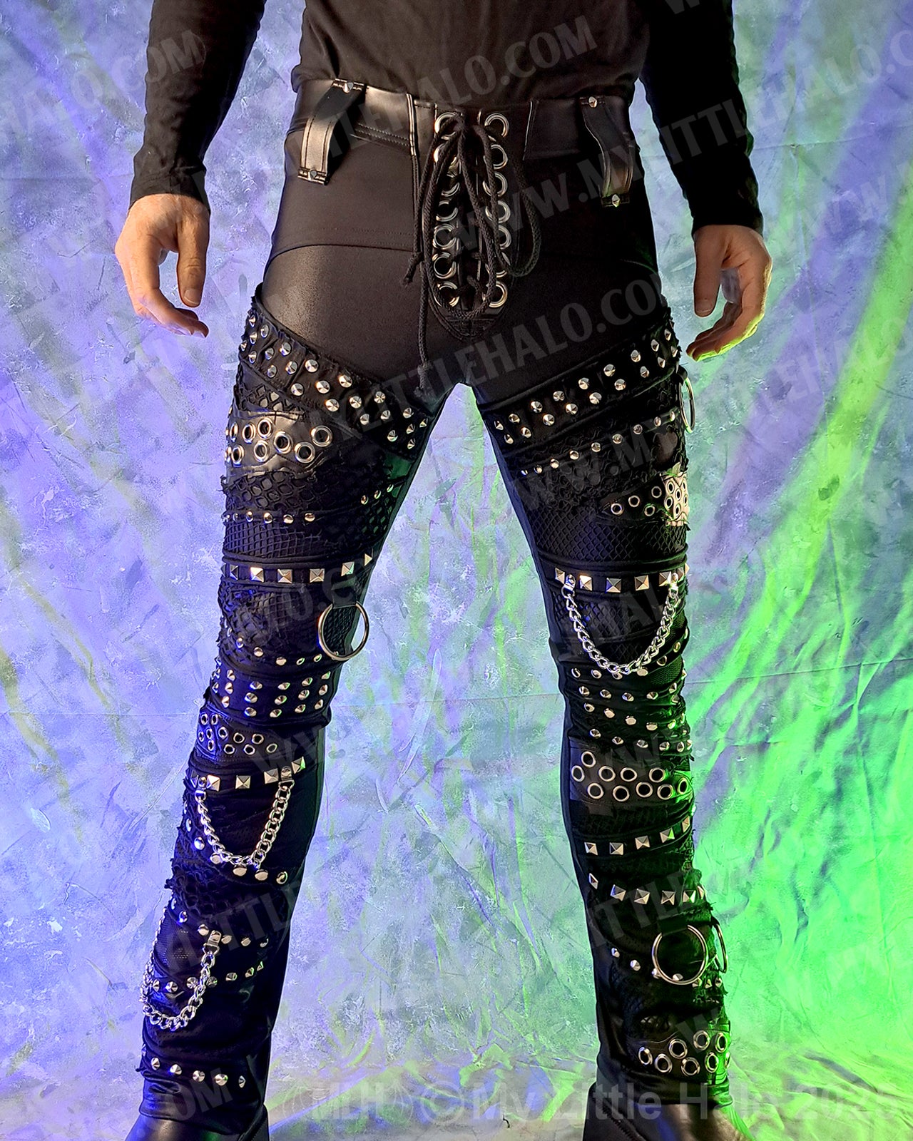 Men’s straight leg rock pants in matte black spandex with collage style front featuring wet look, fishnet, faux leather and loads of silver eyelets, rivets, rings and chains. The pants have riveted faux leather overlays, back pockets with eyelet detail, lace up fly, belt loops and stretch faux leather waist. One of a kind.