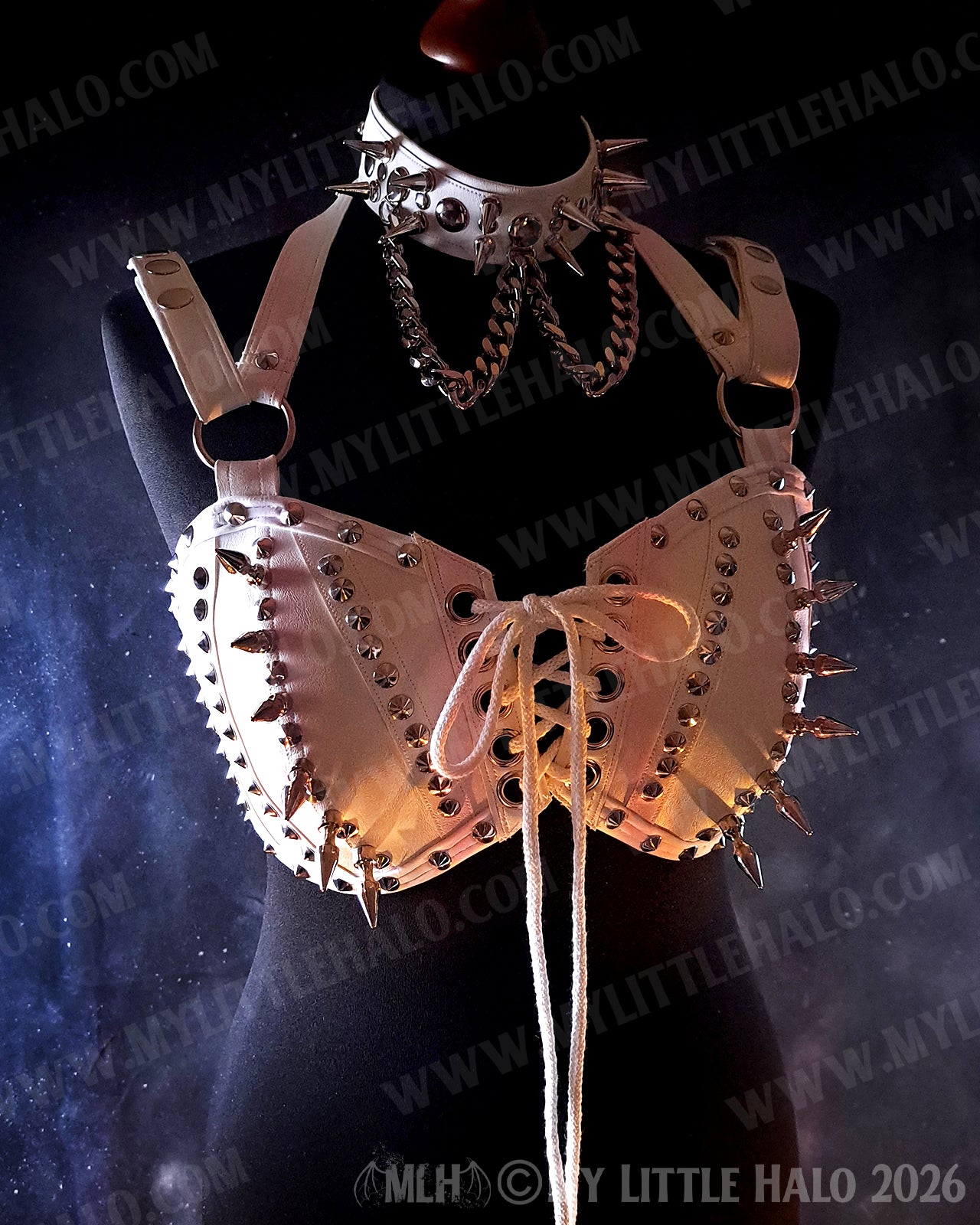 This piece is covered in cone rivets and with extra large spikes on the bust, it is sure to turn some heads. The front features a lace up closure with white cord that can be easily adjusted to fit. This bralette has an adjustable lace up front closure and two sets of adjustable straps so you can relax while you’re out and about, knowing this top is secure. The standard straight straps and halter-neck strap can both be largely adjusted to fit using snap popper fastenings to get the best fit for you. The internal white spandex lining ensures maximum comfort against the skin without compromising style on the outside.
