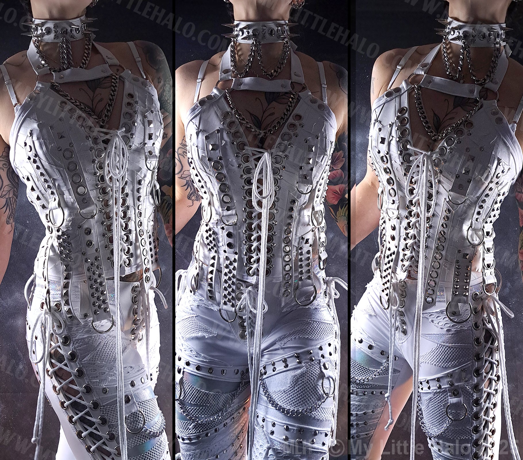 This white bustier is a statement piece to complete your white fit and make you stand out. The “buckle straps” are covered in heavy metal hardware, including D-rings, O-rings, eyelets and rivets. Each strap is unique and made from scratch. The leatherette front of the bustier holds the body while the super stretchy back allows for a comfortable wear and also allows for a wider range of sizes to fit. The front is covered in distressed white leatherette creating texture in the background while the buckle straps make it pop. The bustier features a halter neck strap which is highly adjustable at the back of the neck with a secondary decorative strap across the chest with more silver rings and chunky metal chain. The back and sides both feature more silver rivets and the internal spandex lining feels soft and comfortable against the skin.