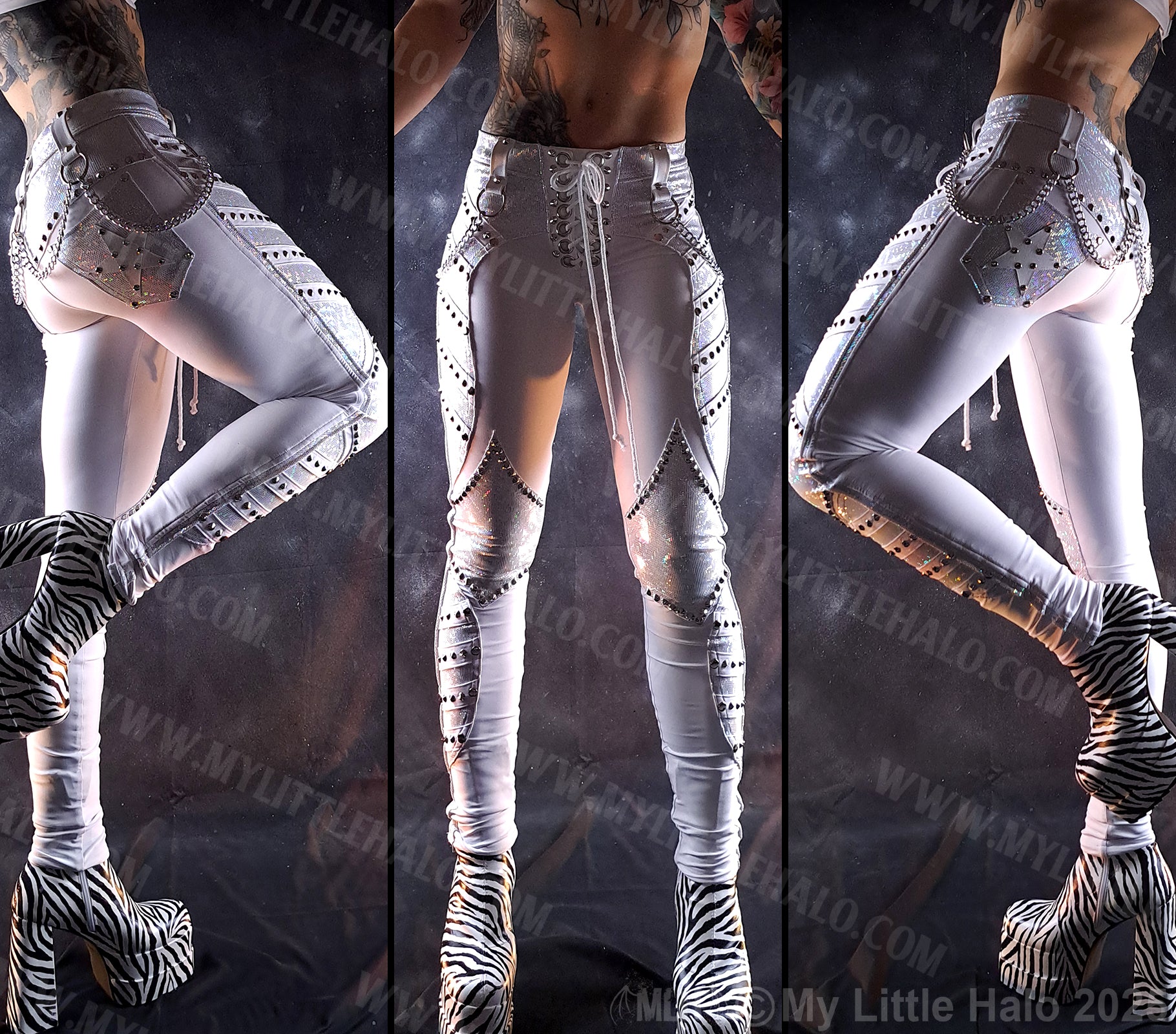 These super glam skinny leg pants are sure to steal the show with their figure flattering curved overlay panels and holographic fabric that shimmers as you move. The matte white rivet strips create texture and contrast and the riveted knee panels make them pop even more. The base fabric is a soft, matte white spandex which offers comfort and breathability. The back features matching holographic butt sculpt overlays and pockets with white faux leather stars, both surrounded by silver cone rivets. The pants have a comfortable holo spandex high stretch waistband with functional studded, lace up fly. The pants also have white belt loops with metal O-rings and silver chains hanging around the waist.